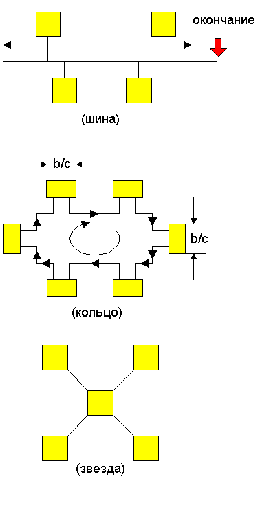 различную топологию сети (звездная, шинная, кольцевая и др.).