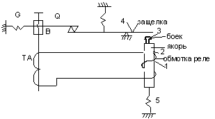 освобождает механизм привода выключателя Q и пружина G его отключает,