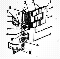 преодолевает натяжение пружины 5 и бойком 3 ударяет по защелке 4. Защелка