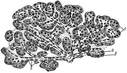 Рис 1. Поджелудочная железа: 1 - долька; а -
