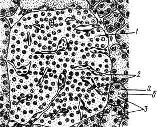 Рис 3, Долька поджелудочной железы: 1 - ацинус;
