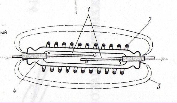 принцип действия геркона показаны на рис.4.1.1 В откачанный стеклянный баллон 4