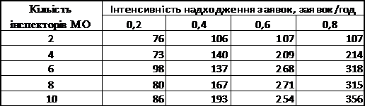 заявок при 8 та 10 працюючих інспекторів. Якщо інтенсивність становить 0,6, то
