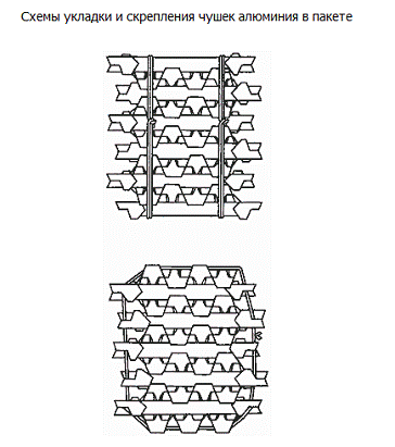 Рис. 2. Схемы укладки и скрепления чушек алюминия в пакете