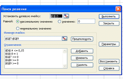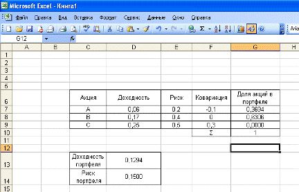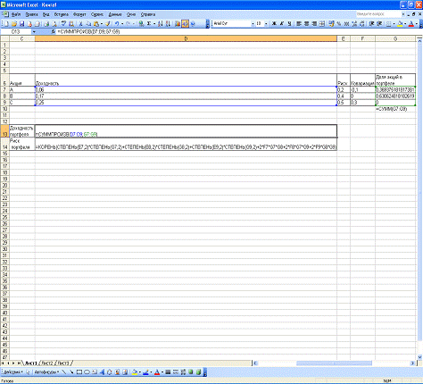 Состав портфеля: А - 0,3694, В - 0,6306, С - 0.