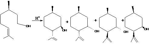 циклизацией цитронеллаля в изопулегол в присутствии кислых катализаторов: