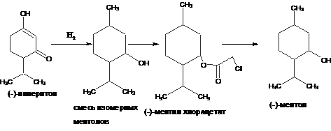 получают смесь изомерных ментолов, из которой (-)-ментол выделяют с помощью