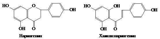 образуются халконы (например, флаванону нарингенину соответствует халкон