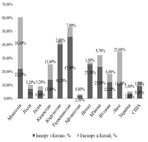 рис. 2.4, про частку експорту та імпорту Китаю у сукупному ВПП країни, тобто