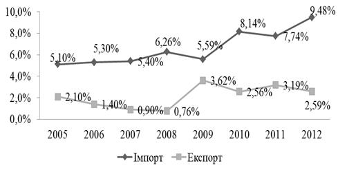 експортну та імпортну квоти, від 2005 р. можна спостерігати, що найменша частка