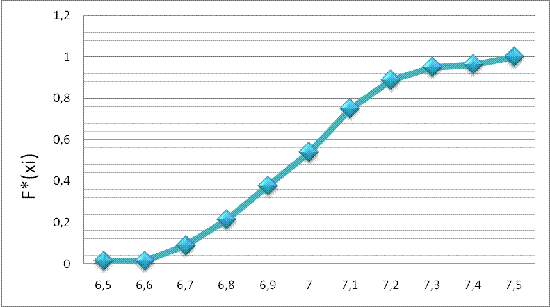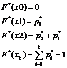 гистограмму распределения можно построить статистическую функцию распределения F*(xi). Для этого необходимо выбрать несколько точек, удобно