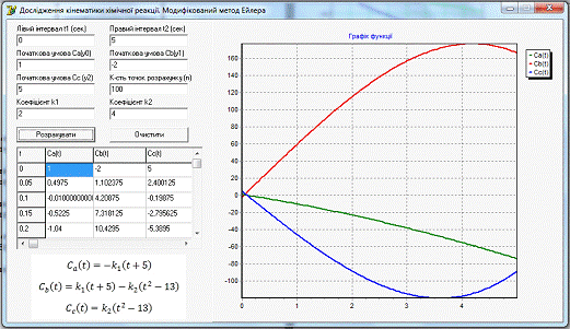 then.Enabled:=false;.Visible:=true;.RowCount:=n+2;.Cells[0,0]:='t';.Cells[1,0]:='Ca(t)';.Cells[2,0]:='Cb(t)';.Cells[3,0]:='Cc(t)';.Cells[0,1]:=floattostr(a);.Cells[1,1]:=floattostr(ya);.Cells[2,1]:=floattostr(yb);.Cells[3,1]:=floattostr(yc);:=(b-a)/n;:=1;:=ya+Ca(a+h/2)*h;:=yb+Cb(a+h/2)*h;:=yc+Cc(a+h/2)*h;:=a+h;:=y1;:=y2;:=y3;:=i+1;.Cells[0,i]:=floattostr(a);.Cells[1,i]:=floattostr(y1);.Cells[2,i]:=floattostr(y2);.Cells[3,i]:=floattostr(y3);i>n;.Clear;.Clear;.Clear;i:=1