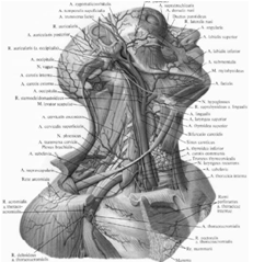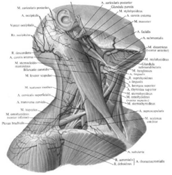 ушная артерия, грудинно-ключично-сосцевидная артерия.