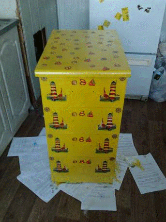 . Дала высохнуть клею. Покрыла тумбочку лаком.