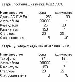 ?'Товары, поступившие позже 15.02.2001.'