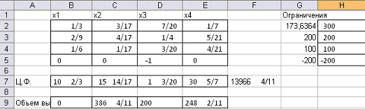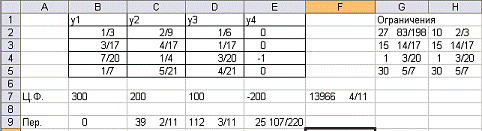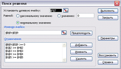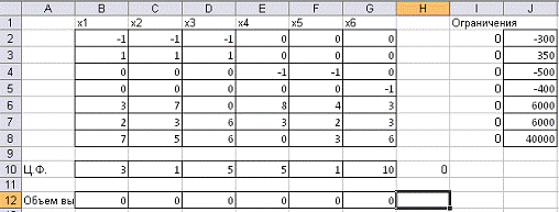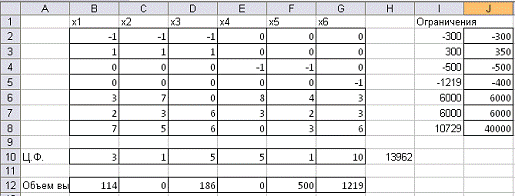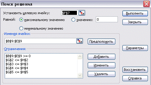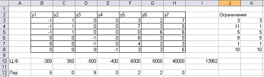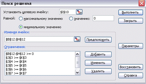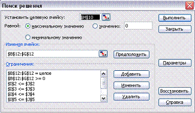 ограничения: B12:G12=целое и ≥ 0; I2≤J2; I3≤J3; I4≤J4;