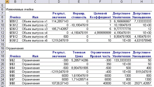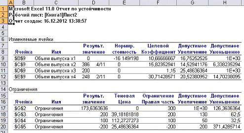 сведения о чувствительности решения (нормируемая стоимость и теневая цена) к
