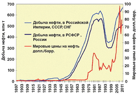 добыче нефти в России и мировые цены на нефть в 1897 - 2011 гг.