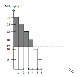 Потребитель будет покупать товар до тех пор, пока MU>P (предельная полезность