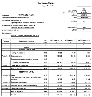 Баланс ОАО «МегаФон Ритейл» за 2012 г.