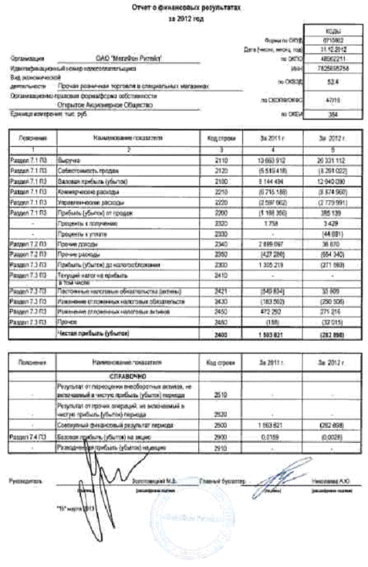 Отчет о прибылях и убытках ОАО «МегаФон Ритейл»