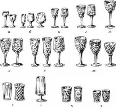 червоного вина; є - келихи для шампанського; ж - келихи для коньяку.