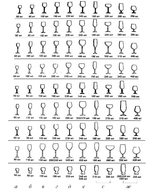 настоянок, 50 мл); г - чарки для міцних та десертних вин (мадери, 75 мл); д -