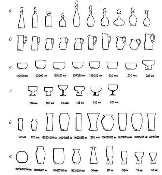 багатопорційні) без ніжки та на ніжці; г - креманки однопорційні; д, е - вази