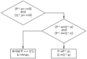 (P^.n=Q^.n) Then Begin Write('P = Q'); b:=true; End