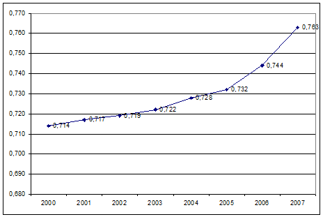 2009 году был равен 0.394, увеличившись по сравнению с 2007 годом на 1,1%.