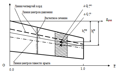 Расстояние от условной оси до линии ц.д. в корне и конце крыла [ 0.714м;