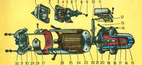 латунная шина, контактные винты, постоянный магнит, якорь с осью, стрелки и