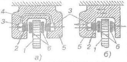 - диск; 2 - поршень; 3 - цилиндры; 4 - канал; 5 - скоба; 6 - колодки