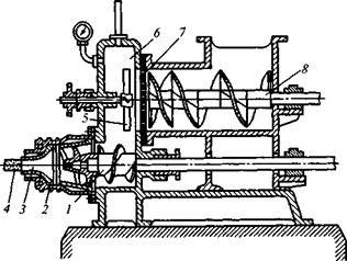 масса продавливается винтовым конвейером 8 через решетку 7 в вакуумную камеру