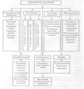 розглядаються різні види підлогових покриттів, їхні властивості, сфери