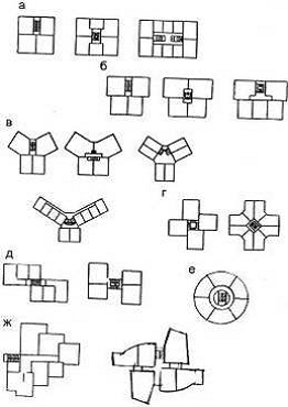жилых домов: а - квадратные и прямоугольные; б - Т-образные; в - трехлучевые; д
