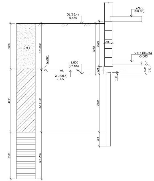 особенности каждого слоя грунта, справа от геологического разреза строится эпюра