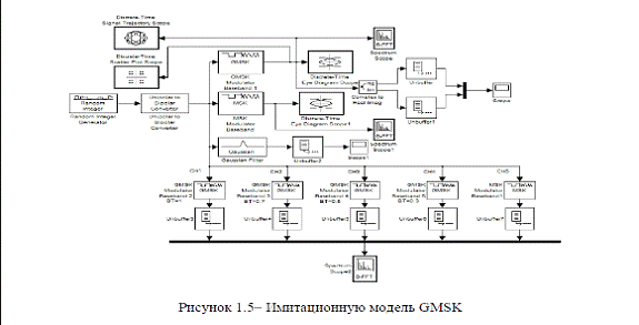 Исследовать модель GMSK предварительно установив в блоках модели параметры для