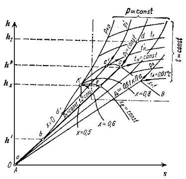 в критичній точці К. Киплячій воді відповідає ступінь сухості х = 0, кривій