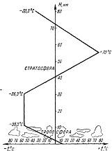 составляет -56°С. С высоты 30 км и до 55 км температура воздуха повышается до