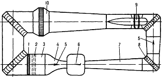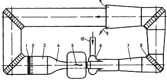 диффузор, 8 - колено с поворотными лопатками, 9 - компрессор 10 -