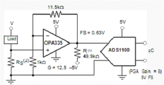 повному масштабі струму, повномасштабний введення в ADS1100 є 0.63V.