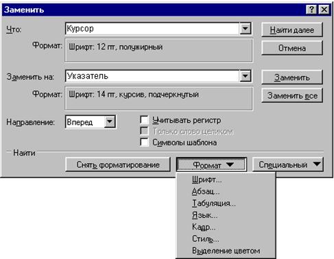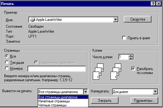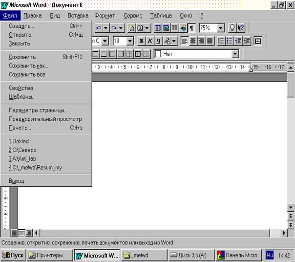 документе (количество страниц, местонахождение курсора и т.д.), а при указании