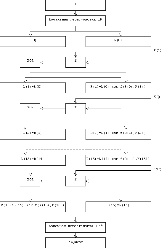 64-битового блока, шестнадцати циклах шифрования и, наконец, обратной