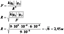 .3 Знайти відстань між зарядами q1=1мкКл, q2=6мкКл,