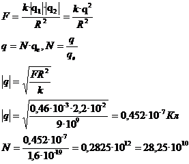мають однакові негативні заряди й взаємодіють із силою 0,46 мН. Визначити