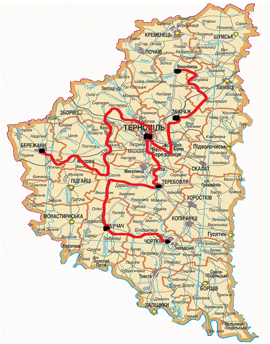 у Тернопільській області, розробка схеми маршруту з описом його пунктів,