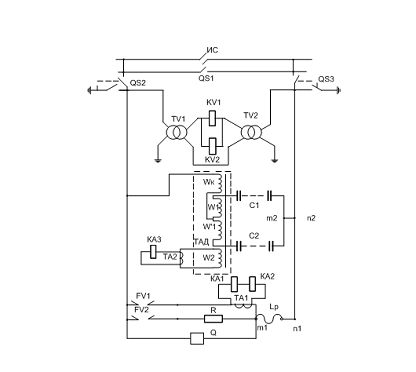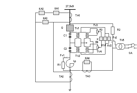 КА2, КА3- реле тока; FV1, FV2- разрядники ; ТА1, ТА2- трансформаторы тока; TAD-