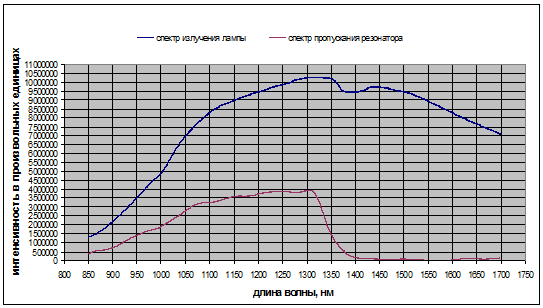 Рисунок 34 - Спектр излучения лампы, спектр пропускания резонатора без