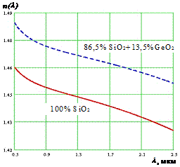волны нулевой дисперсии совпадает со вторым окном прозрачности (l=1310 нм) - при этом коэффициент затухания a не превышает 0,35 дБ/км, а коэффициент хроматической дисперсии D